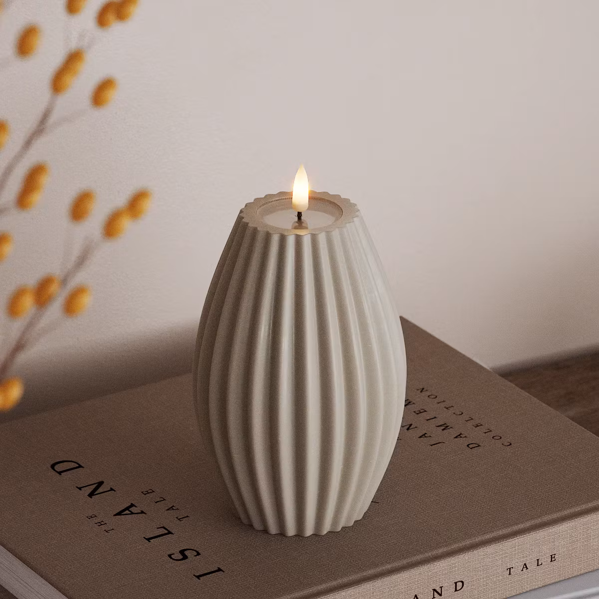 Detta eleganta LED blockljus i sandfärg med en räfflad yta ger ditt hem en varm och inbjudande känsla. Tillverkat av paraffinvax och resin, erbjuder det både en klassisk design och säker belysning utan öppen låga. Perfekt för att skapa en mysig atmosfär i alla rum. Specifikationer: Färg: Sand Material: Paraffinvax / Resin Mått: 10x15 cm (exkl. flamman på 2 cm) Batteri: 2 x AA (Ingår inte) Batteritid: 300+ timmar Detta LED blockljus ger långvarigt, säker belysning som passar perfekt för både vardag och fest.