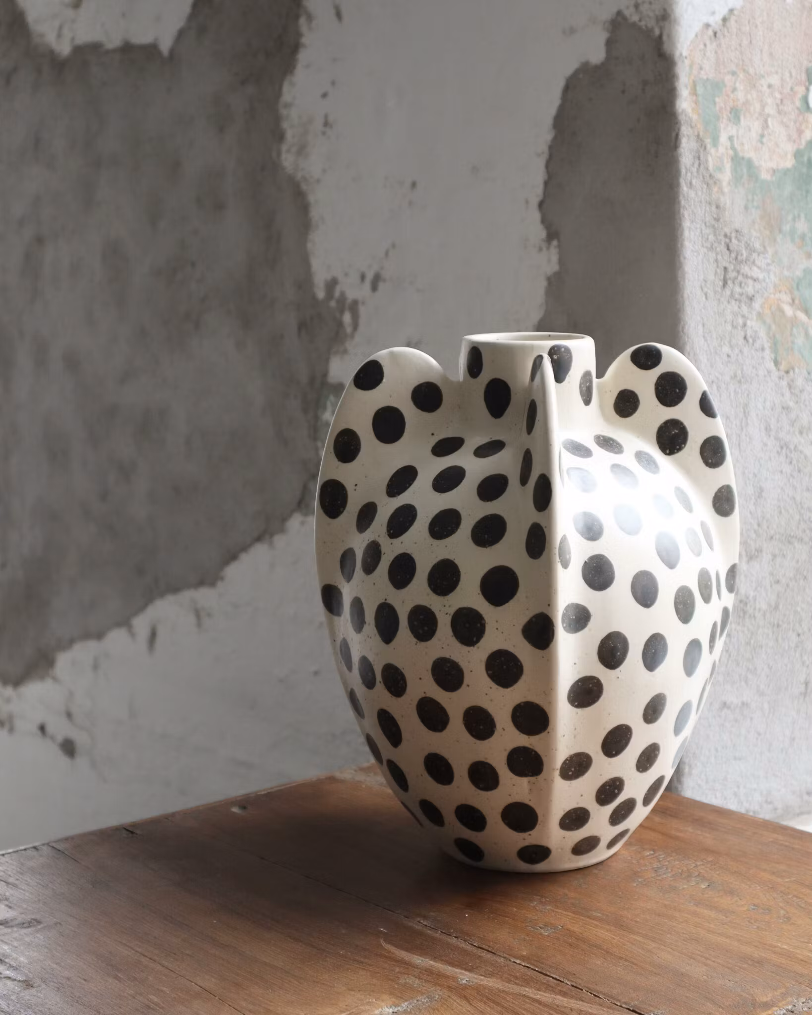 Get inked - en vas som balanserar mellan det tidlösa och det trendiga, med sitt härliga mönster av svarta prickar. Den klassiska polka-pricken får nytt liv här, där varje prick känns både lekfull och sofistikerad. Vasens form är allt annat än ordinär, den är särskilt utformad för att sticka ut och skapa ett konstnärligt uttryck i rummet. Mönstret är tidlöst, men själva formen ger en modern twist som gör att vasen känns både aktuell och egen. Det svarta och vita kontrastmönstret skapar en elegant enkelhet, samtidigt som den ovanliga formen ger ett djärvt intryck som inte går obemärkt förbi. Varje prick bär på sin egen karaktär och tillsammans skapar de ett harmoniskt men samtidigt dynamiskt mönster som ger vasen liv och rörelse. Designad av den visionära kreatören Storm Storm, bär vasen på en energi som är omöjlig att ignorera. Den är både tidlös och nyskapande, en symbol för kreativ frihet som smälter samman det klassiska och det moderna på ett naturligt sätt.