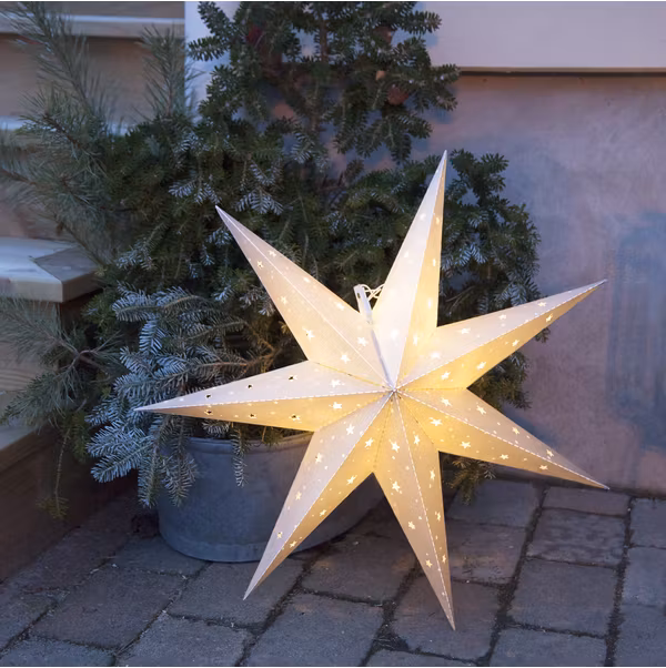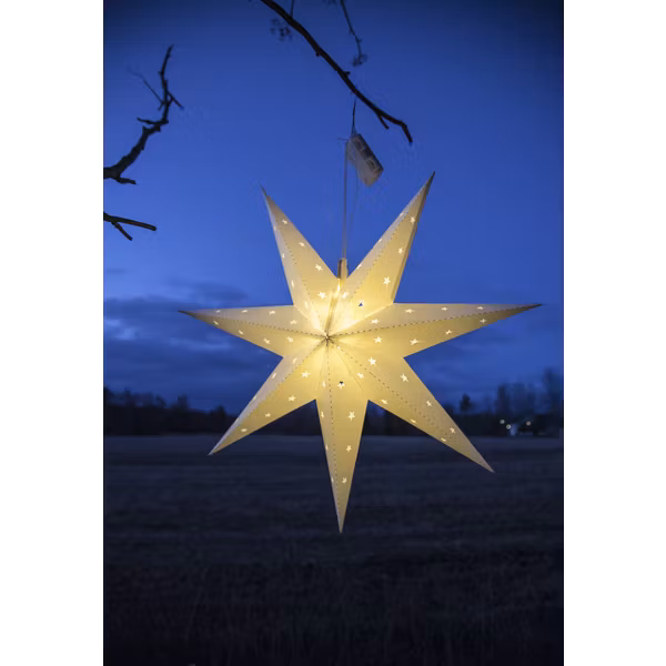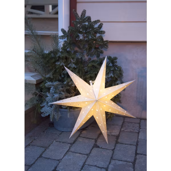 Batteridriven stjärna med dekorativa mönster för utomhusbruk. Stjärnan har 12 LED-ljuskällor med varmvitt sken. Den inbyggda timern (6 h på, 18 h av, repeterande) gör det lätt att ställa in när dekoration ska lysa. Lyser upp din balkong, trädgård eller uterum med mera och sprider en härlig vinterkänsla.