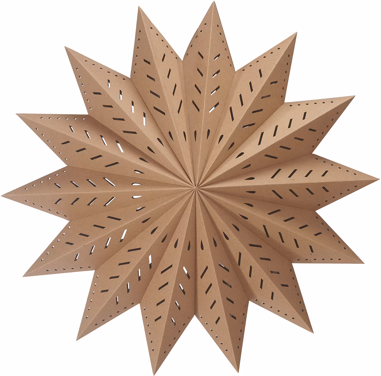 Julstjärna i papper av en lite kraftigare kvalitet med stansade hål som silar ljuset på ett vackert sätt. Stängs med snöre och snörstopp. Köp till E14 sladdstäl