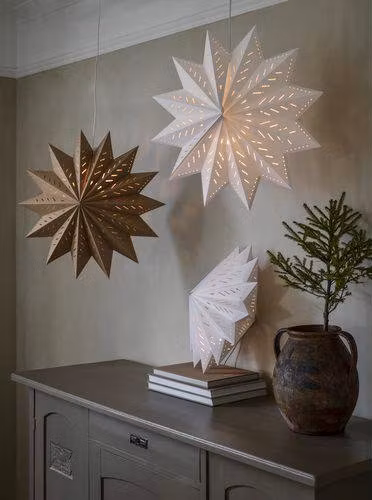 Julstjärna i papper av en lite kraftigare kvalitet med stansade hål som silar ljuset på ett vackert sätt. Stängs med snöre och snörstopp. Köp till E14 sladdställ och ljuskälla, max 25W. Höjd 60cm, bredd 60cm och djup 37cm
