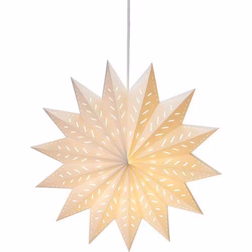 Julstjärna i papper av en lite kraftigare kvalitet med stansade hål som silar ljuset på ett vackert sätt. Stängs med snöre och snörstopp. Köp till E14 sladdställ och ljuskälla, max 25W. Höjd 50cm, bredd 50cm och djup 30cm