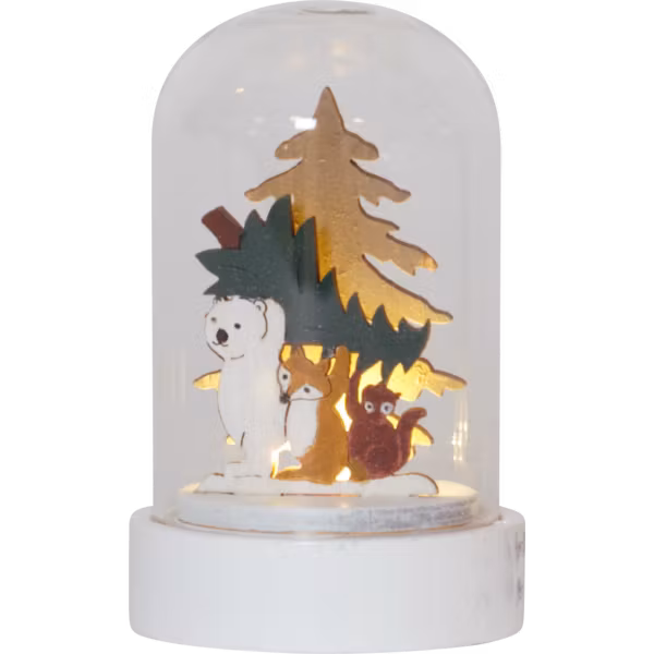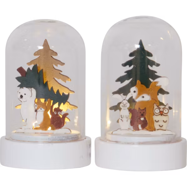 Design Charlotte Falck. Dekorativa kupoler med sceneri i laserskuren trä. 2-pack med motiven: 1. Räven, haren och ugglan väntar i skogsgläntan för att fira jul tillsammans med sina vänner. 2. Isbjörnen och räven är också de på väg för att fira julen tillsammans med sina vänner. Små ledlampor lyser upp motivet och ger en stämningsfull känsla. Glaskupolerna är 9 cm höga och drivs av batterier som ingår.