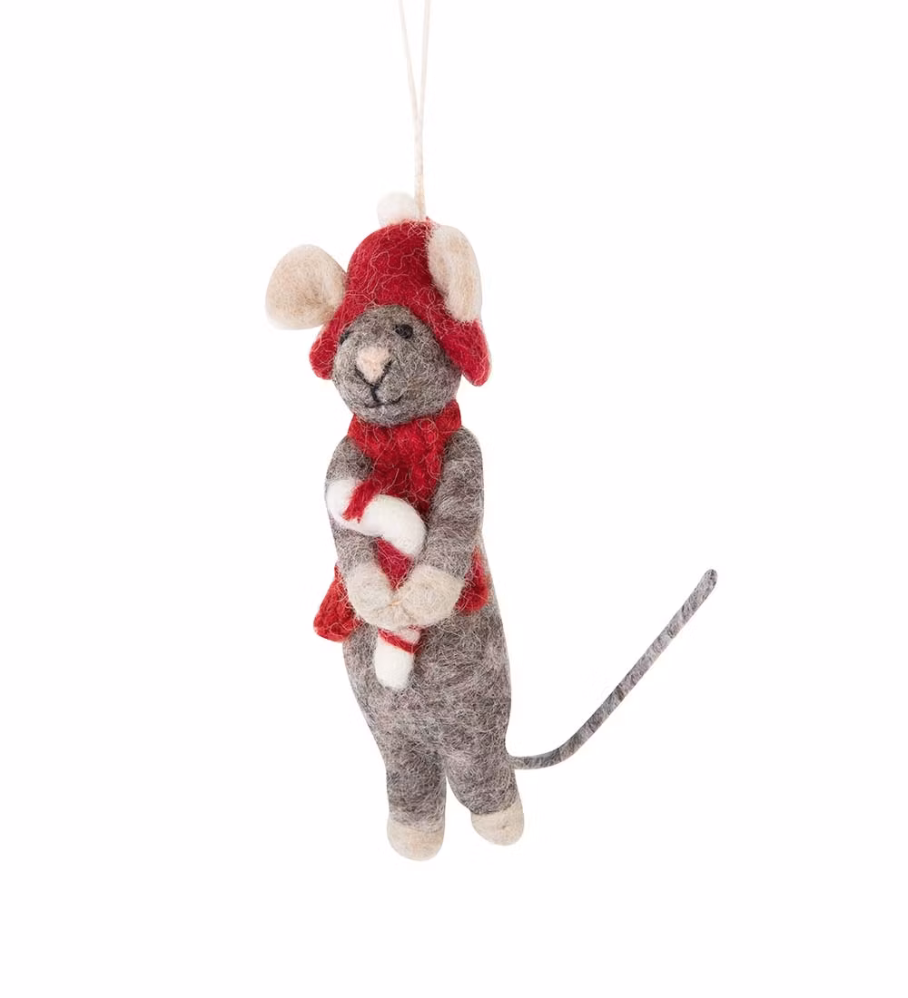 Sötaste juldekorationen i form av en toftad mus med stickad halsduk och mössa. Färdig med snöre för upphängning.