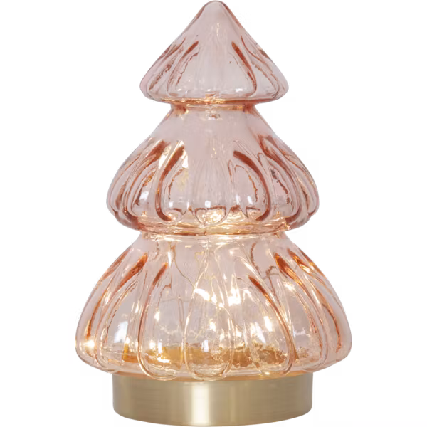 Snygg bordsdekoration i form av en 20 cm hög gran i transparent rosa glas. Guldfärgad bas som gömmer batteriboxen. Drivs av 3 st AAA batterier (ingår ej) och har timerfunktion, 6 h på, 18 h av, repeterande. Perfekt till dekoration på julbordet och ger ett hemtrevligt sken i hemmet.