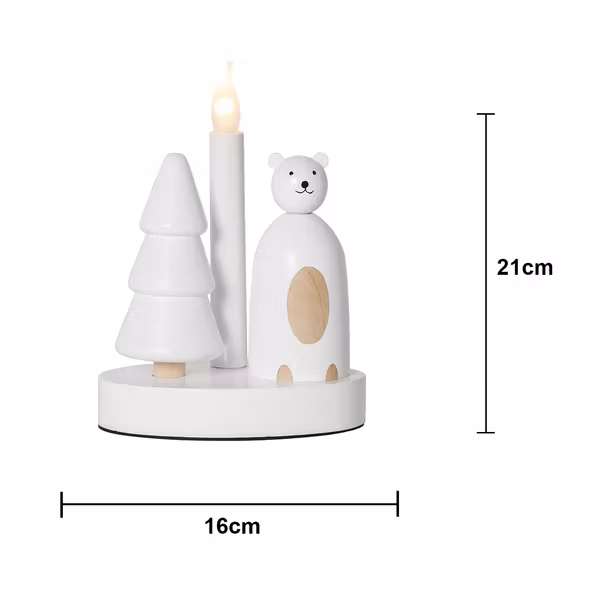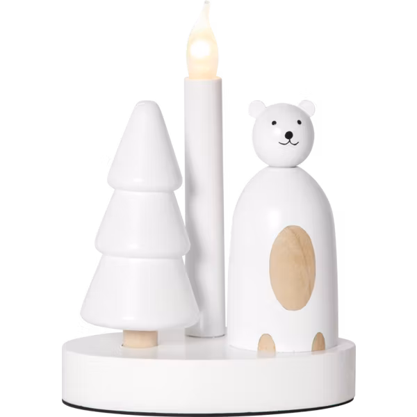 Julens härligaste dekoration i form av en svarvad isbjörn och gran med 1 ljus. Liten adventsljusstake tillverkad i trä. Led lampa ingår. Placera den i ett fönster eller och på en skänk. Härlig adventljusstake att dekorera med till jul.