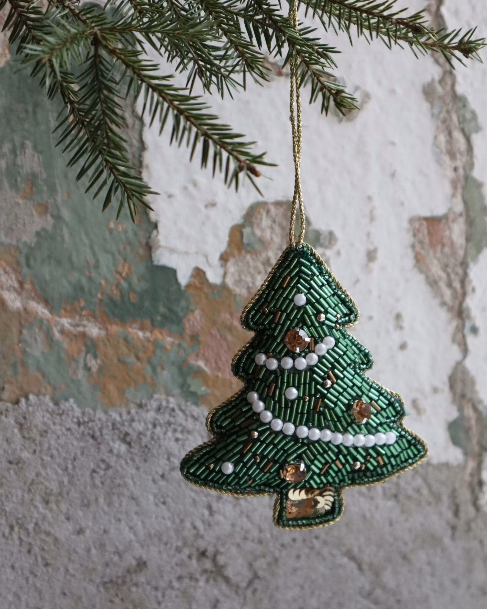 Ge din julgran en glittrande och personlig touch med detta handbroderade julgranshänge i form av en gran. Varje detalj på denna unika juldekoration är noggrant broderad för hand med glaspärlor på båda sidor, vilket ger den en vacker och elegant glans. Denna exklusiva julgransdekoration är mer än bara en dekor - det är ett konstverk som fångar julens anda med sin värme och design. Perfekt för att skapa en mysig och glittrande julstämning, kommer detta julgranshänge att bli ett minnesvärt inslag i din gran varje år. En liten skatt som sätter guldkant på julgranen.