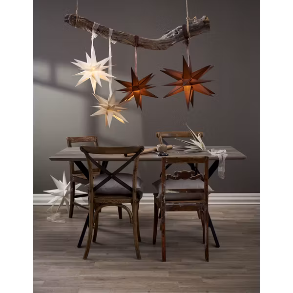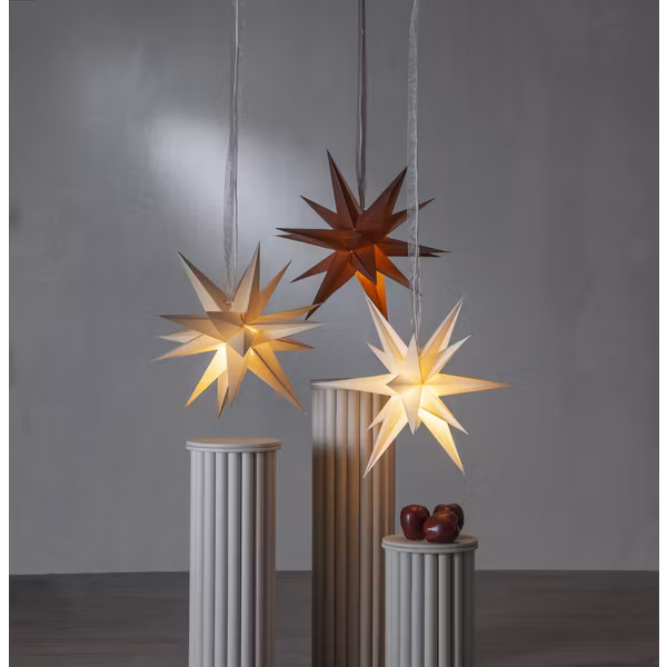Beige tredimensionell pappersstjärna med 18 st uddar och ett vackert dekorationsband. En fantastisk dekoration över bordet, häng dem en eller flera tillsammans. En stjärna som kan lysa upp under vinterns alla månader inklusive novent, december och självaste julafton. Monteras enkelt ihop med hjälp av dragskon och dekorationsbandet. Lägg till sladdställ och ljuskälla för belysning i stjärnan. Stjärnan är 55 centimeter.
