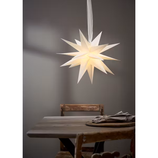 Vit tredimensionell pappersstjärna med 18 st uddar och ett vackert dekorationsband. En fantastisk dekoration över bordet, häng dem en eller flera tillsammans. En stjärna som kan lysa upp under vinterns alla månader inklusive novent, december och självaste julafton. Monteras enkelt ihop med hjälp av dragskon och dekorationsbandet. Lägg till sladdställ och ljuskälla för belysning i stjärnan. Stjärnan är 43 centimeter.