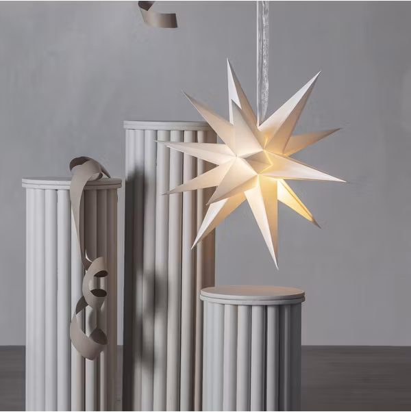 Vit tredimensionell pappersstjärna med 18 st uddar och ett vackert dekorationsband. En fantastisk dekoration över bordet, häng dem en eller flera tillsammans. En stjärna som kan lysa upp under vinterns alla månader inklusive novent, december och självaste julafton. Monteras enkelt ihop med hjälp av dragskon och dekorationsbandet. Lägg till sladdställ och ljuskälla för belysning i stjärnan. Stjärnan är 55 centimeter.