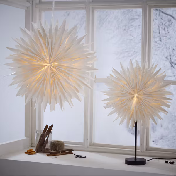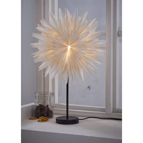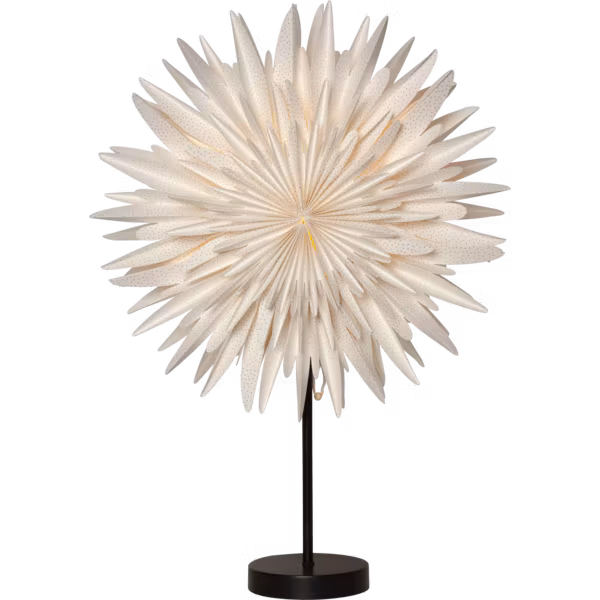 Fantastisk pappersstjärna på svart fot . Stjärnan är vit med guldprickar och tillverkad av tre lager veckat papper. Konturen har runda flikar som gör att stjärnan ser busigt vintrig ut. Adventsstjärnan på fot skapar en perfekt julstämning och ger hemmet den där speciella julkänslan. Kan placeras både i fönster och på en skänk. Stjärnan är 60 cm hög och 40 cm bred.
