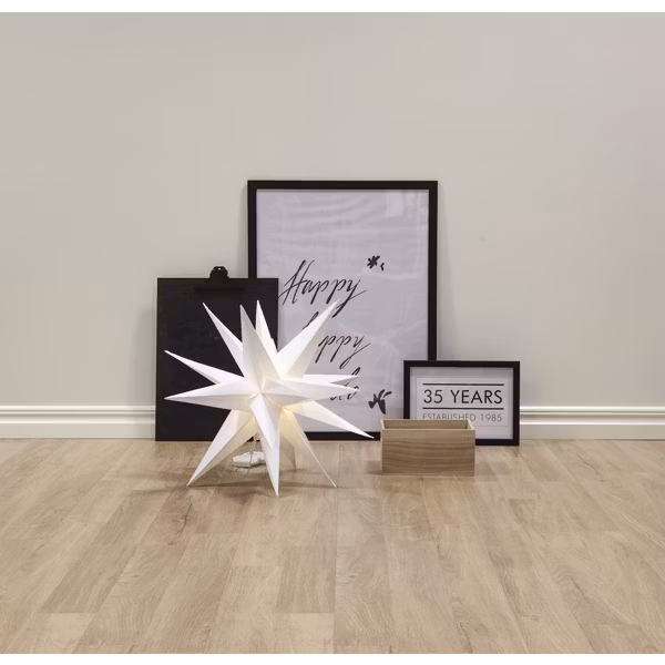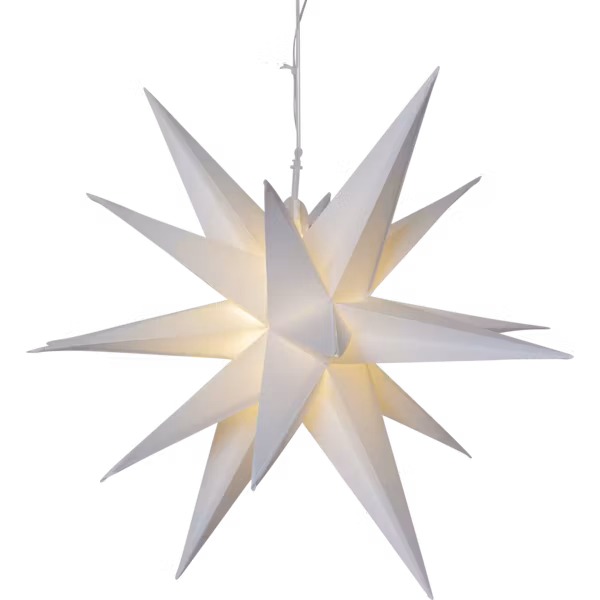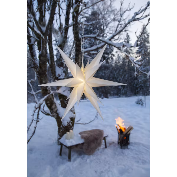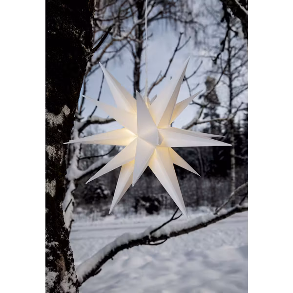 Batteridriven tredimensionell stjärna för utomhusbruk. Stjärnan har 12 stycken LED-ljuskällor som lyser med ett varmvitt sken. Den inbyggda timern (6 h på, 18 h av, repeterande) gör det lätt att ställa in när dekoration ska lysa. Lyser upp din balkong, trädgård eller uterum och sprider en härlig vinterkänsla.