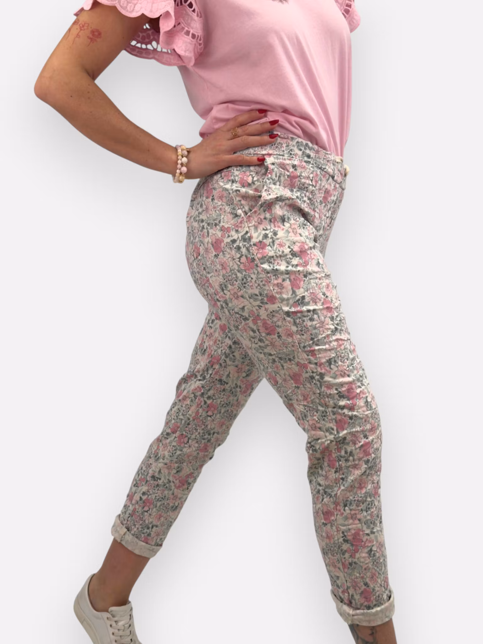 Britta är de perfekta byxorna för dig som vill ha både komfort och stil. Med stretchig passform och livfullt blommönster blir de snabbt ett favoritplagg i garderoben – lika snygga till en enkel topp som till en dressad blus