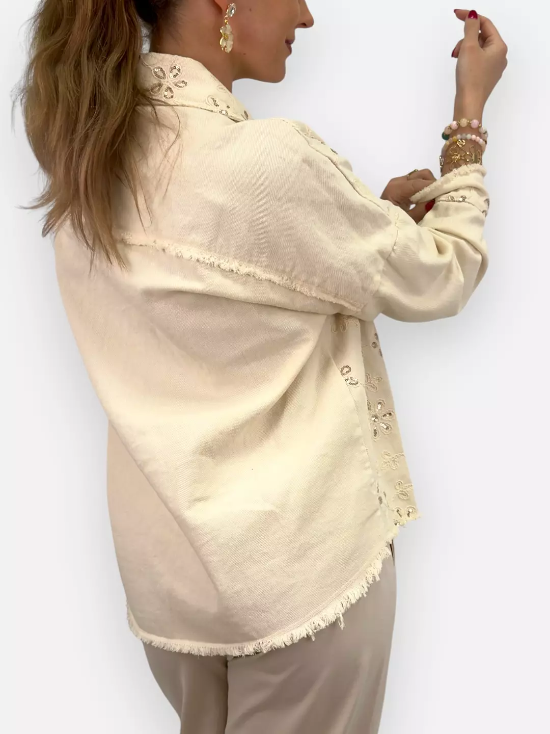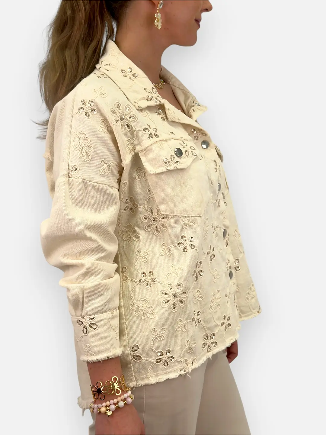 Ragna är jackan som känns som en liten konfettifest du kan bära. Den är sydd i canvas och får ett lekfullt lyft med glittrande paljetter och bröstfickor som ger den där sköna, avslappnade attityden. Cool men ändå feminin – perfekt när du vill dra på dig något som direkt säger “nu händer det”.