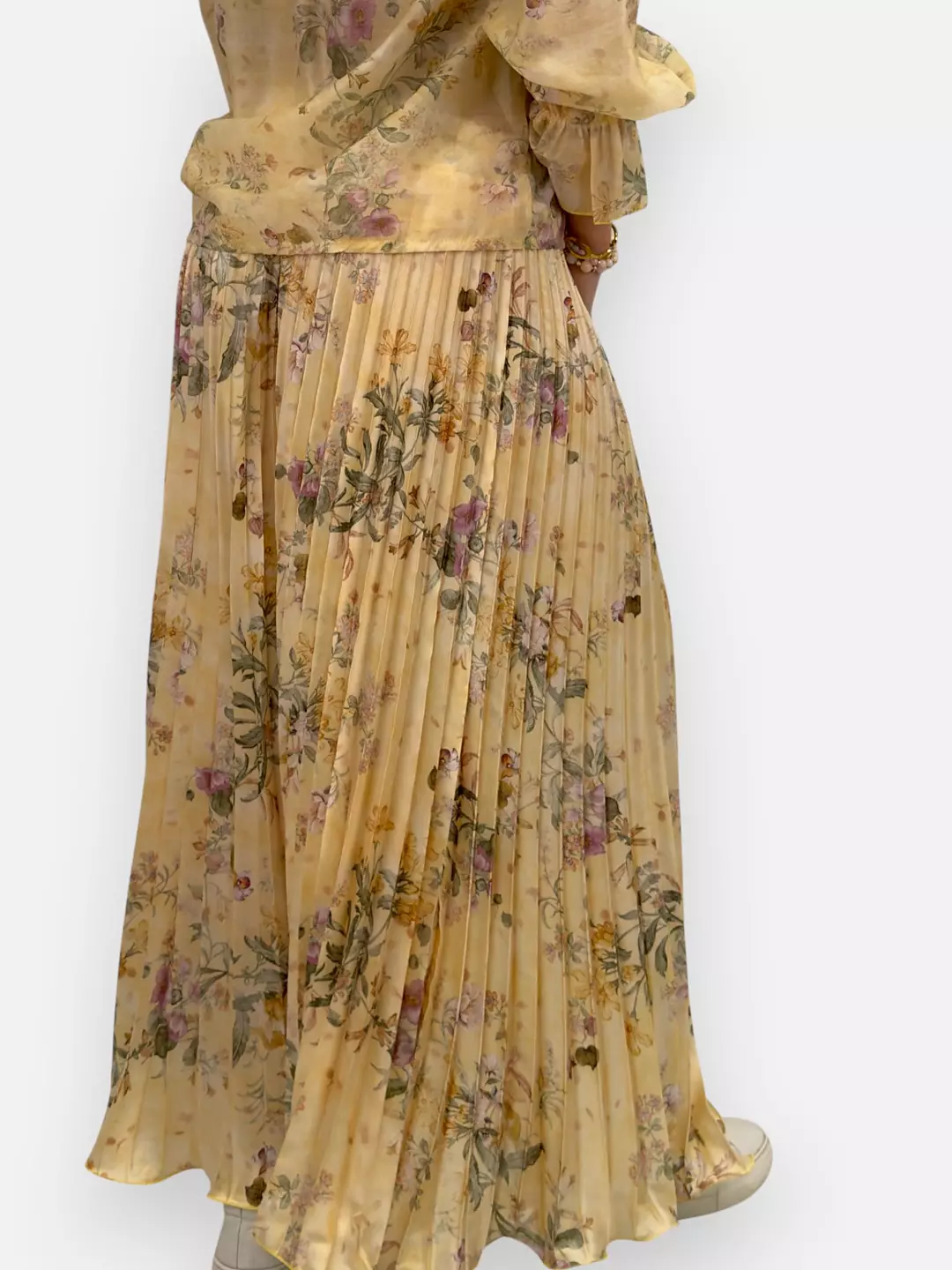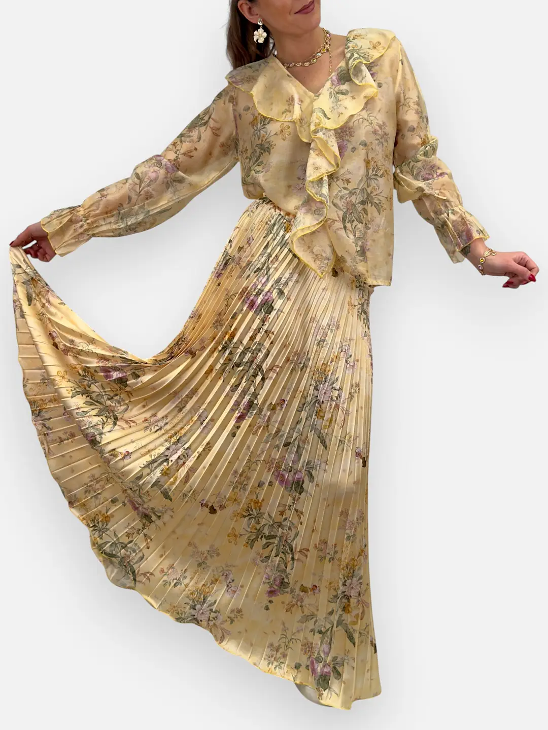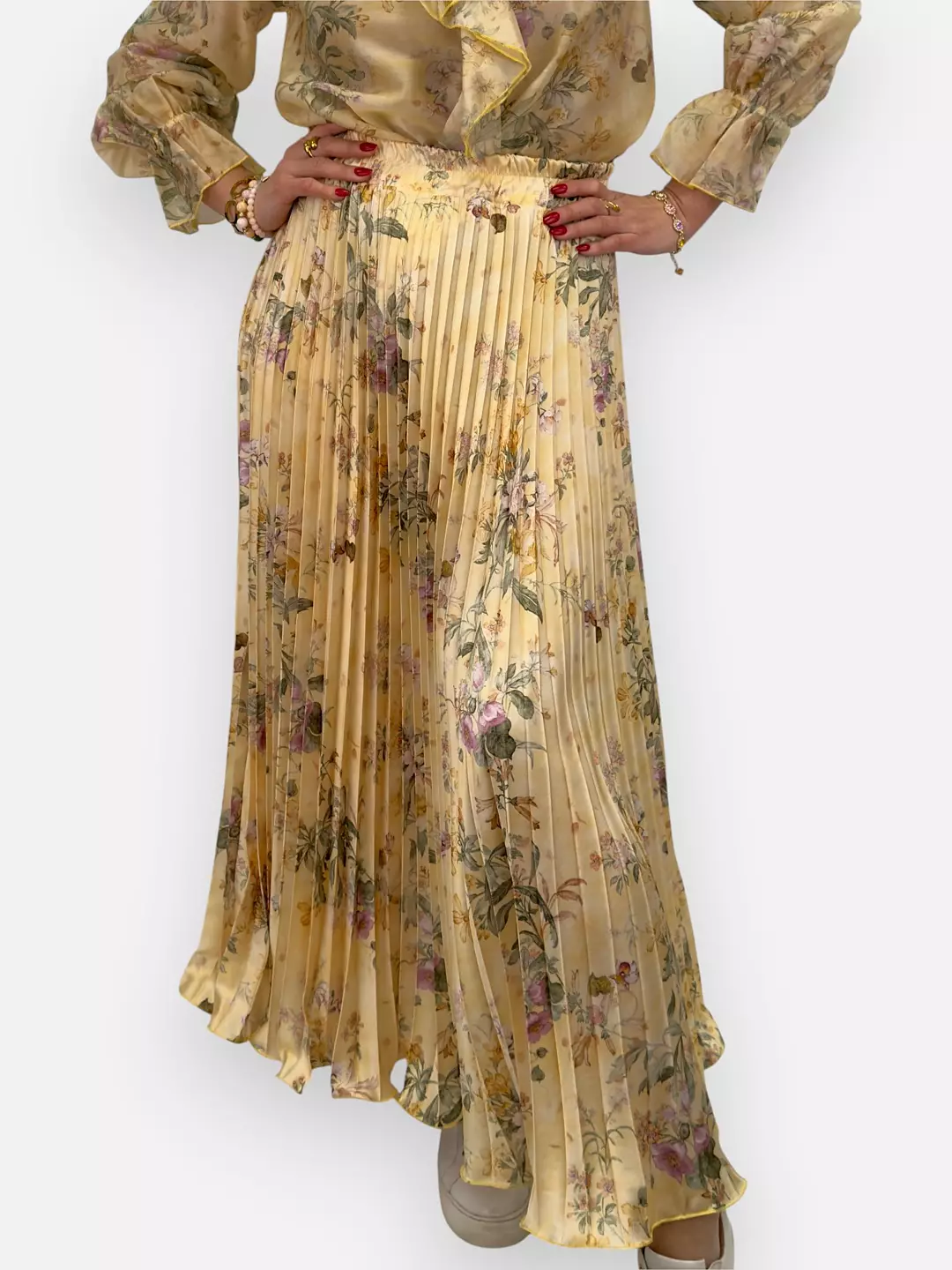Telma är maxikjolen som gör entré innan du själv hunnit säga hej. Den plisserade silhuetten skapar ett böljande fall, medan det blommiga mönstret ger liv och rörelse i varje steg. Feminint, svävande och med precis rätt mängd dramatik – som att promenera genom dagen med vinden som bästa accessoar.