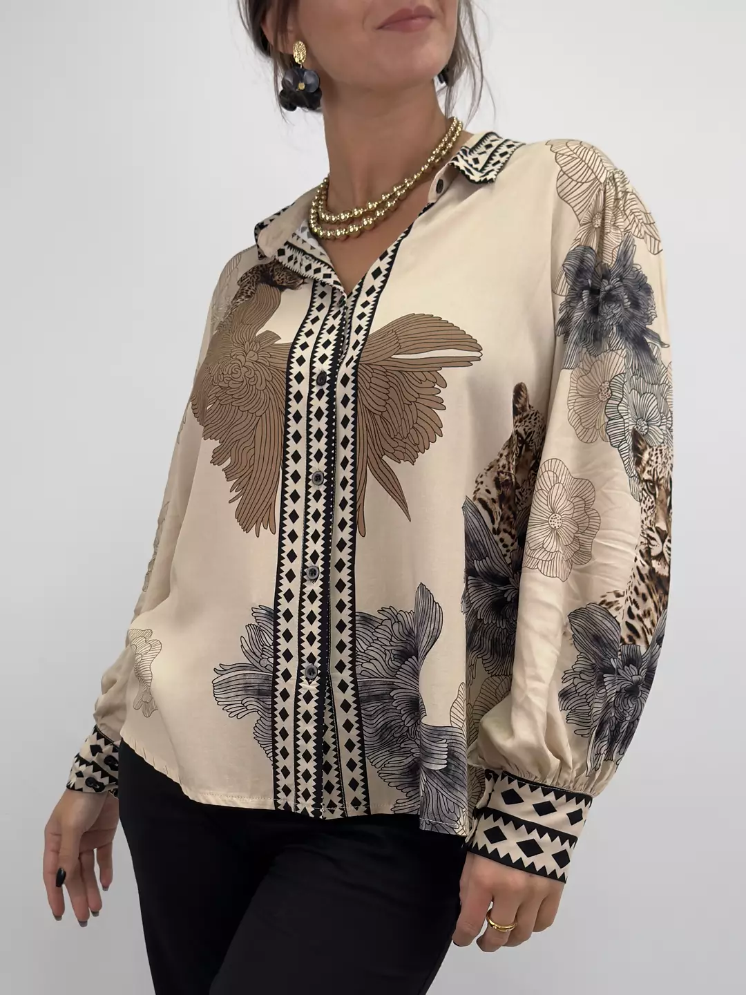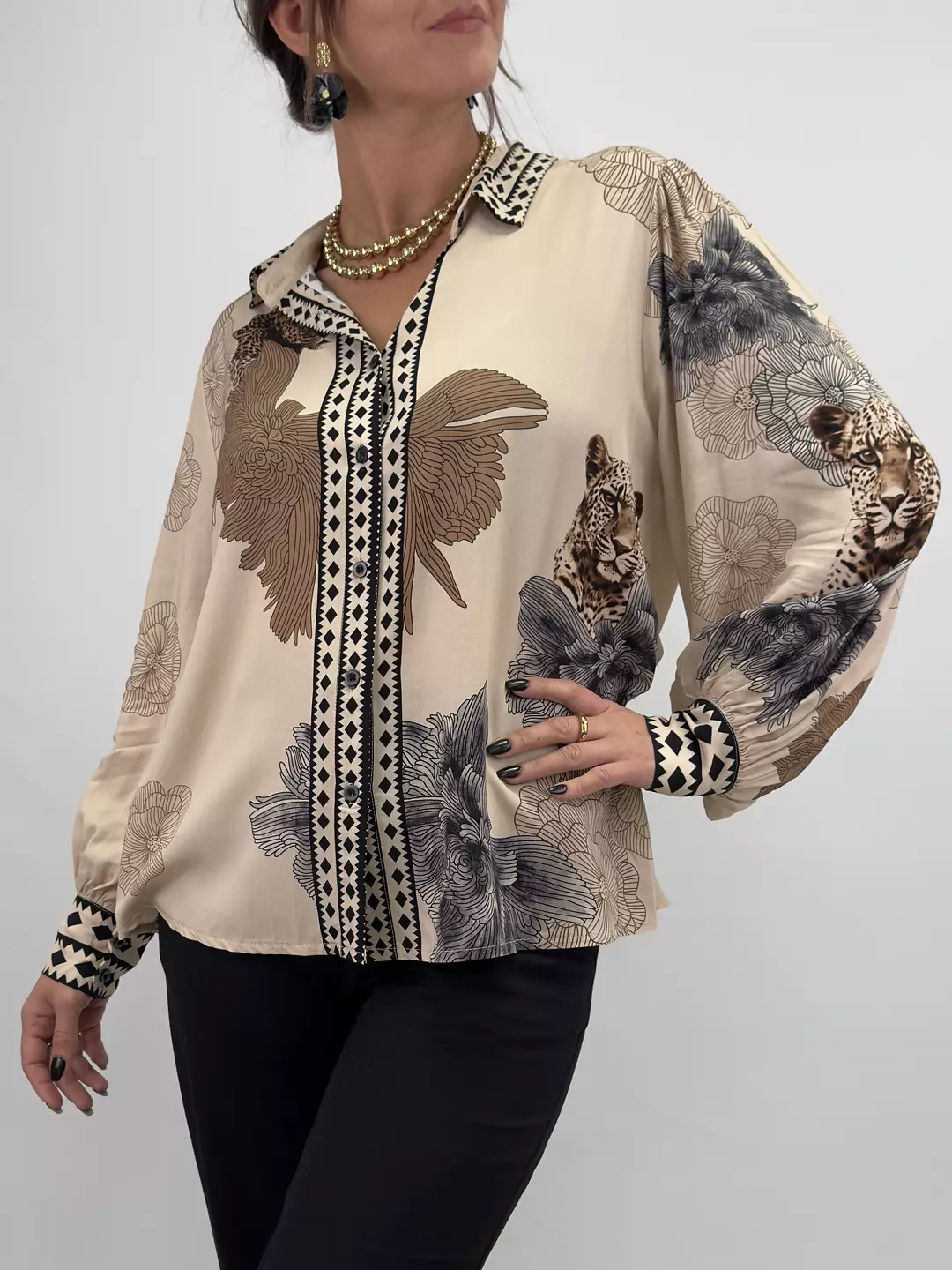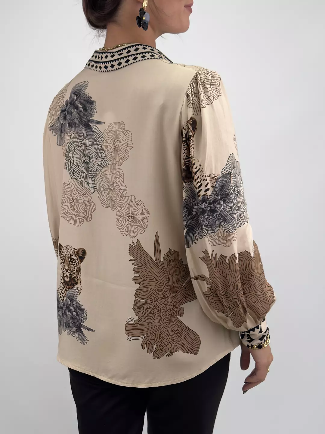 Elva är viskosblusen som sätter stilen med sitt unika mönster av leoparder och blommor. Den luftiga passformen och de vida ärmarna ger en bohemisk känsla med lyxig touch. En riktig statement-blus för dig som gillar att sticka ut – både till vardags och fest.