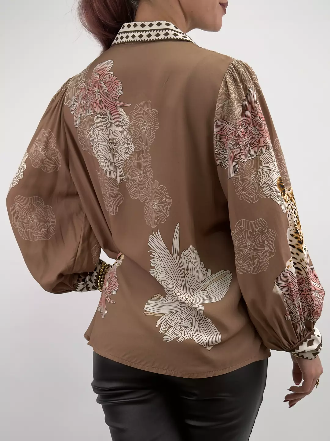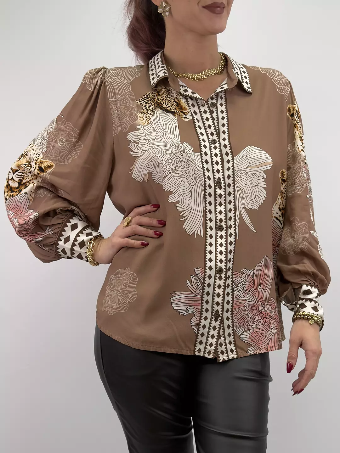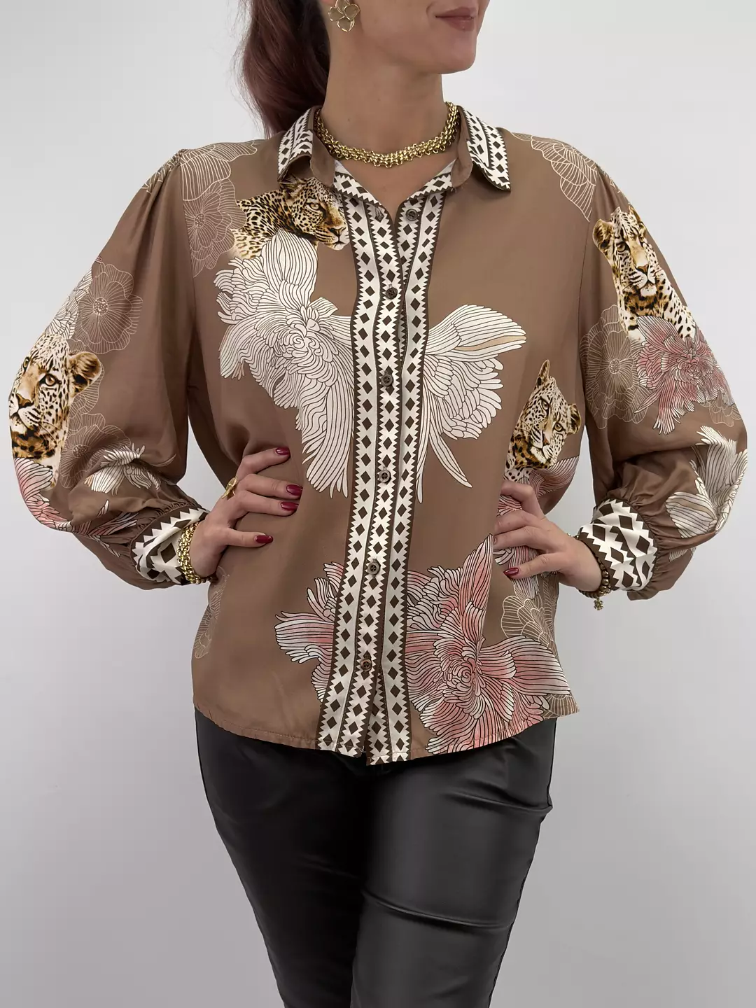 Elva är viskosblusen som sätter stilen med sitt unika mönster av leoparder och blommor. Den luftiga passformen och de vida ärmarna ger en bohemisk känsla med lyxig touch. En riktig statement-blus för dig som gillar att sticka ut – både till vardags och fest.