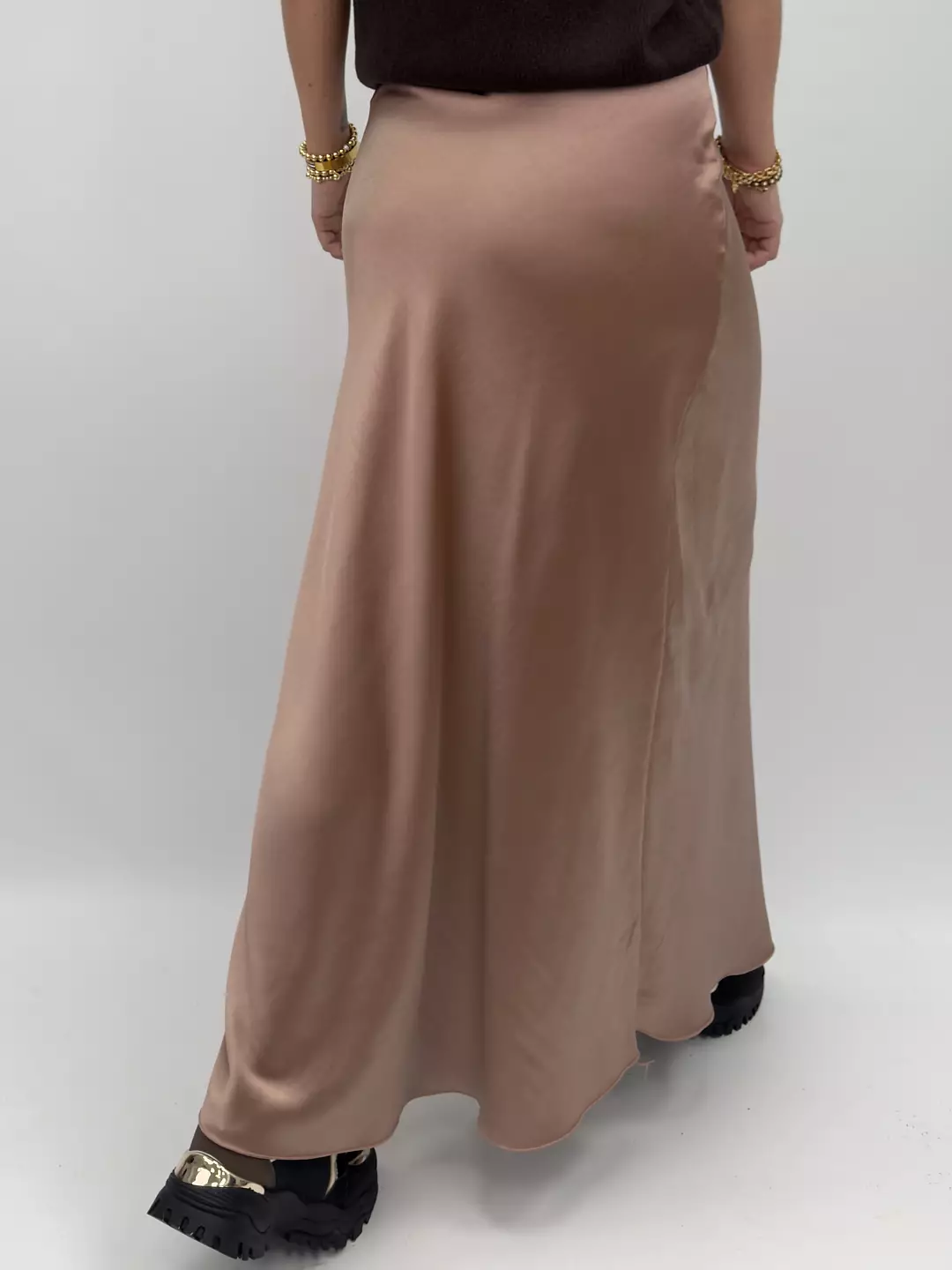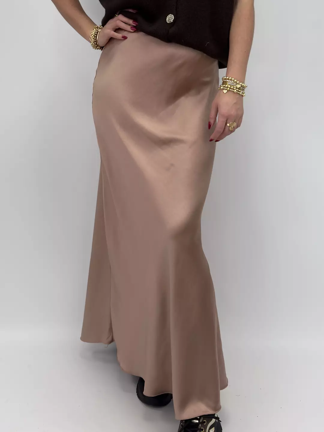 Kajsa är en elegant maxikjol med subtil glans och följsam siluett. Den smickrande modellen sitter bekvämt i midjan och faller vackert längs kroppen – en kjol som passar lika bra till vardags som till festligare tillfällen.