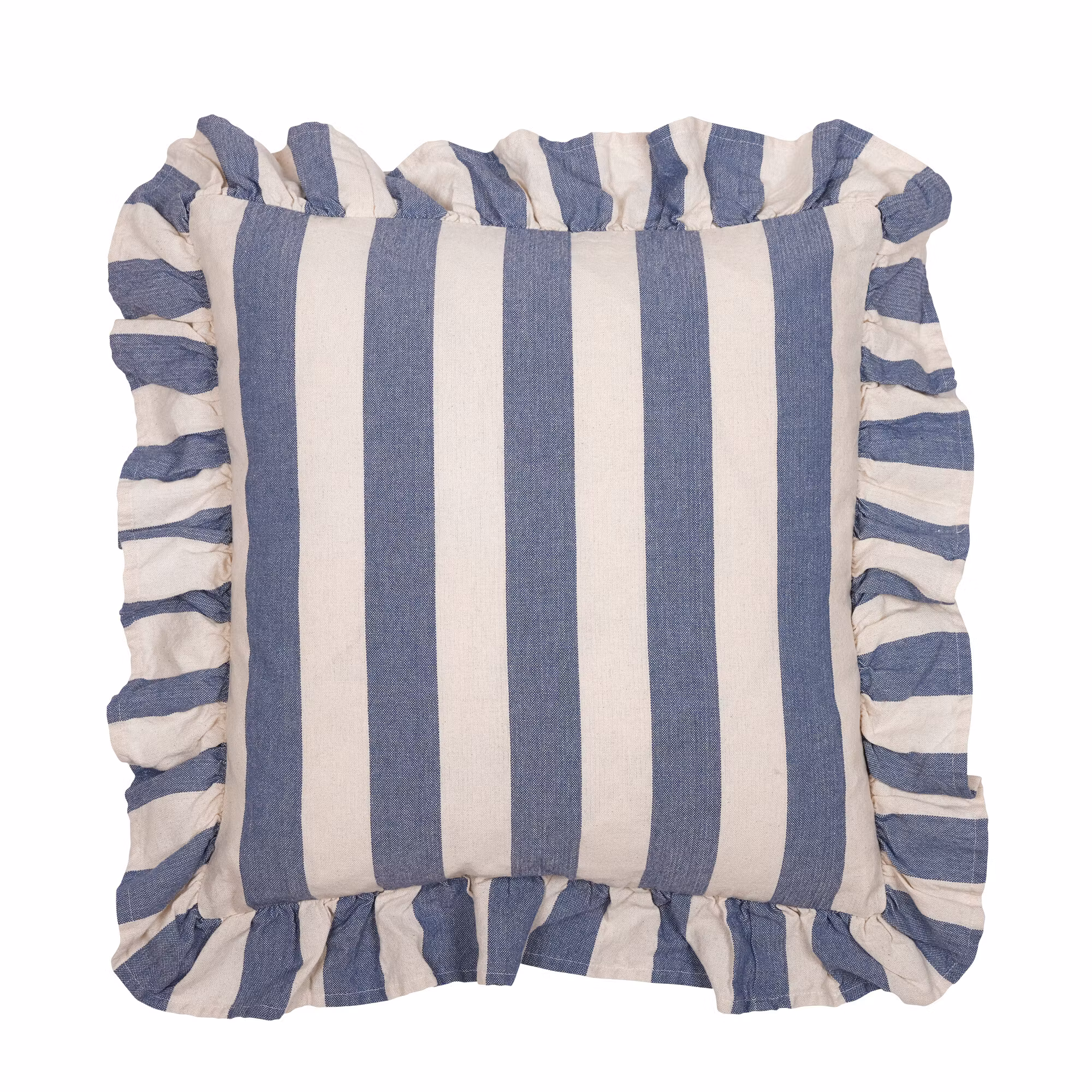 Kuddfodral i fin blockrand med en volangkant runtomkring, tillverkat av en miljövänlig blandning av återvunnna material.