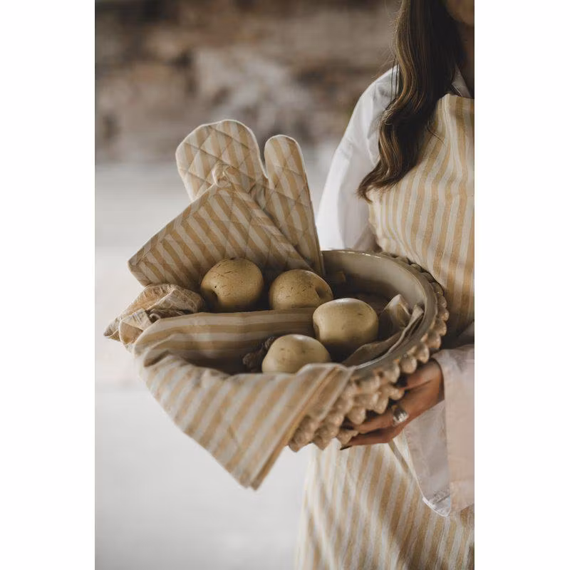 Cuisine kökshanddukar kommer i ett praktiskt 2-pack och pryds av smala, gula ränder som ger köket en fräsch och stilren känsla. Det klassiska randiga mönstret för tankarna till bistrostil och gör handdukarna både funktionella och charmiga. Med sin tidlösa design passar de lika bra för vardagens små sysslor som när du vill addera en elegant touch till köksmiljön. Ett måste i varje hem där både stil och funktion får ta plats.