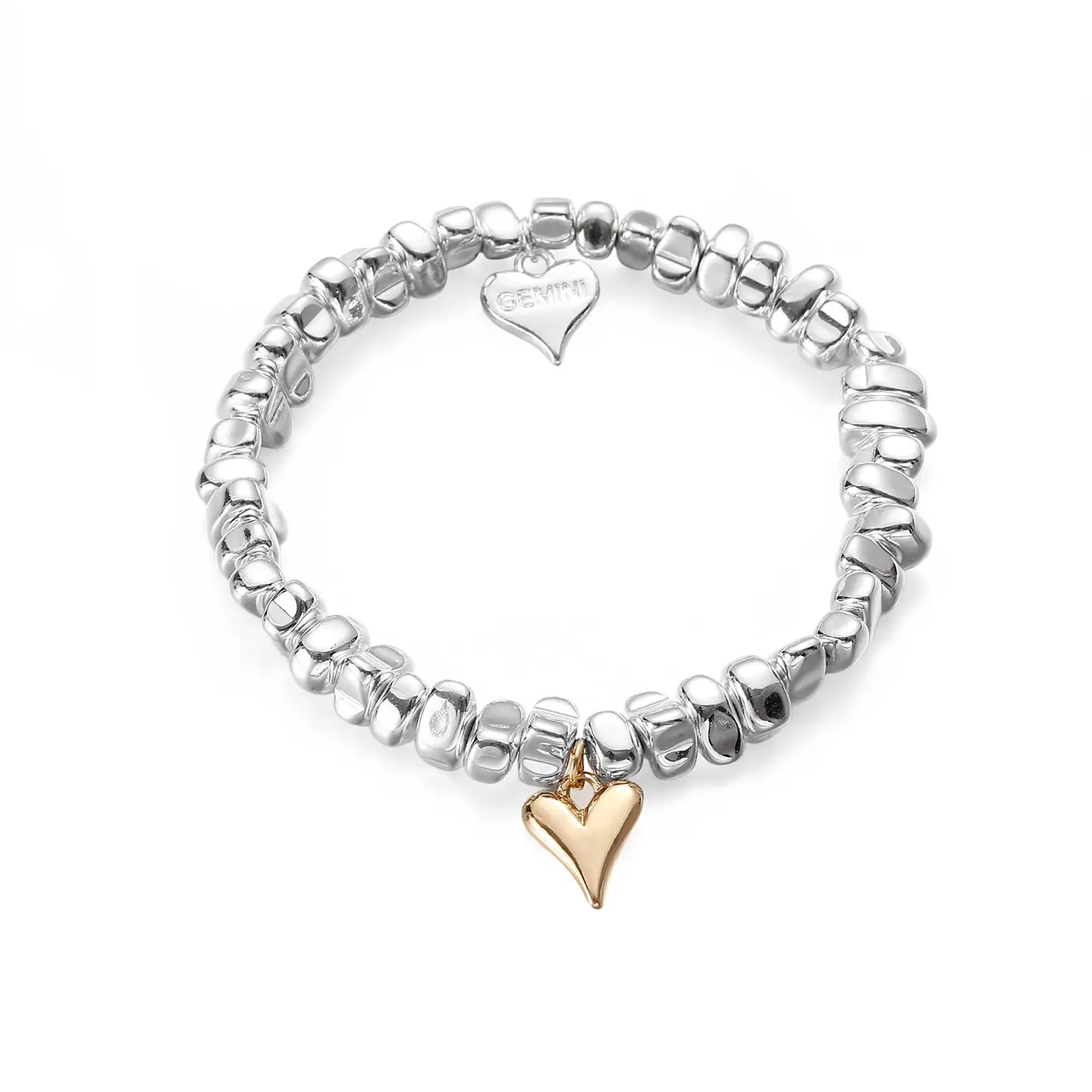 Unikt armband i legering och syntetisk hematit med mjukt formade pärlor och en charmig guldfärgad hjärtberlock. Ett modernt smycke som kombinerar lekfullhet med elegans.