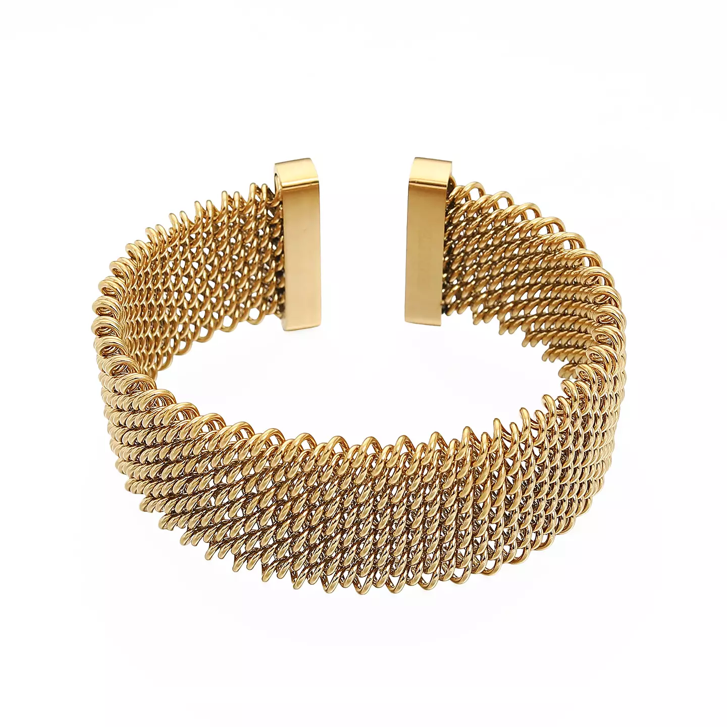 Ett kraftfullt guldfärgat armband med tät, flätliknande struktur som formar sig mjukt runt handleden. Den breda designen ger ett exklusivt och modernt uttryck som känns både självsäkert och elegant – ett statement som lyfter hela din look med stil.