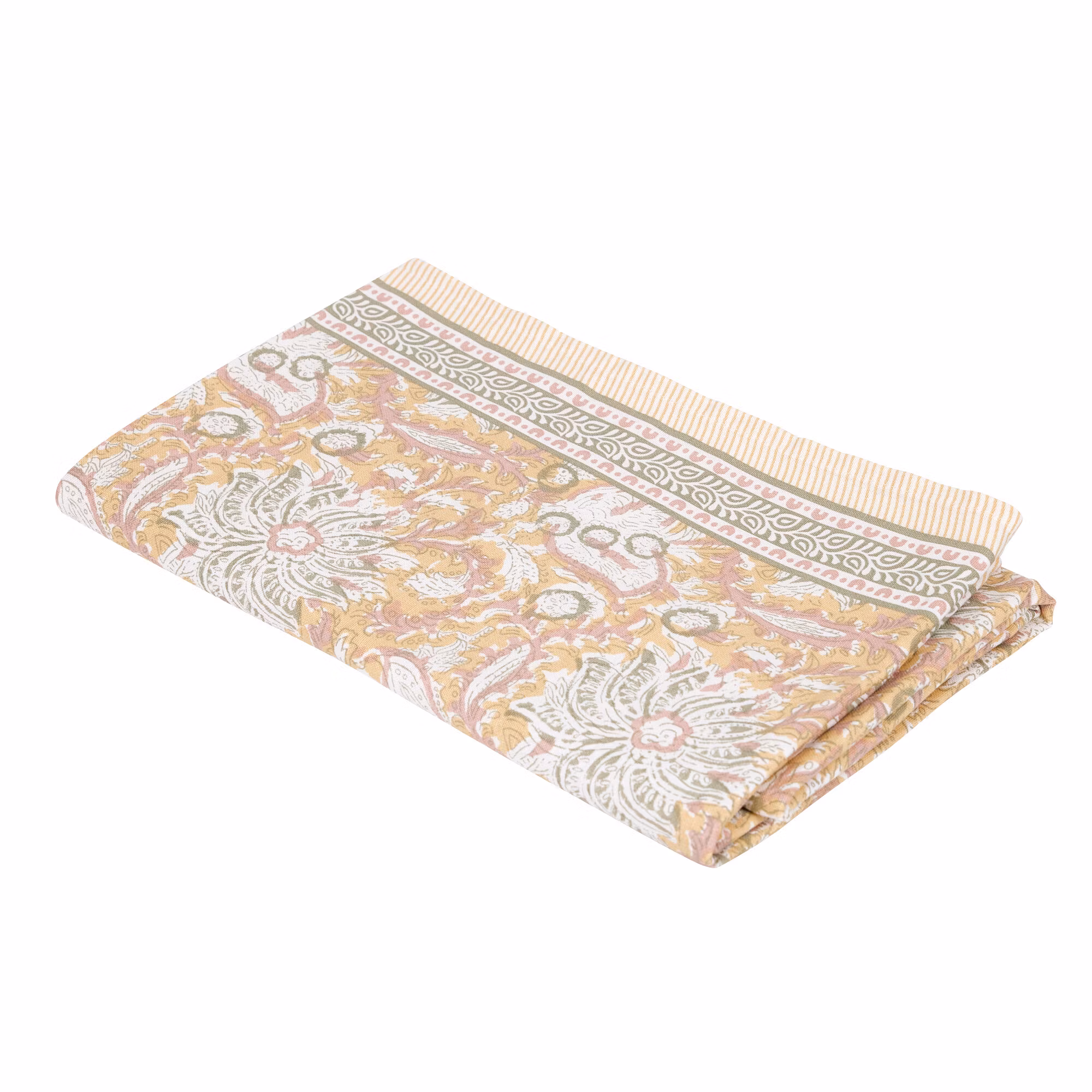 Duk i 100% återvunnen bomull med ett magnifikt mönster och med en vacker bård längs långsidorna i härliga färger, som skapar en inbjudande och ombonad känsla vid varje måltid.